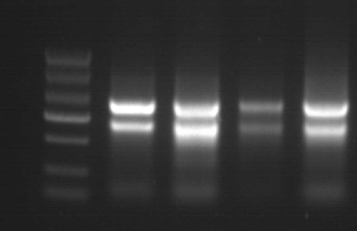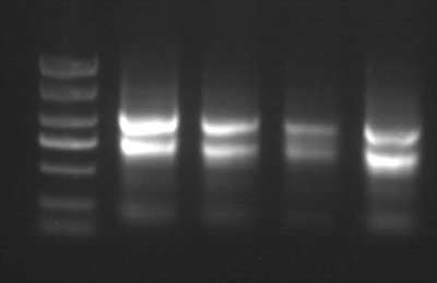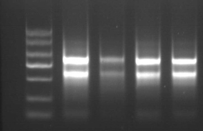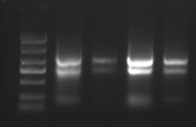 取50mg新鮮樣品,使用ZP434提取總RNA,洗脫體積100μL。 1%瓊脂糖凝膠電泳, 上樣量為2μL,5v/cm電泳15min。