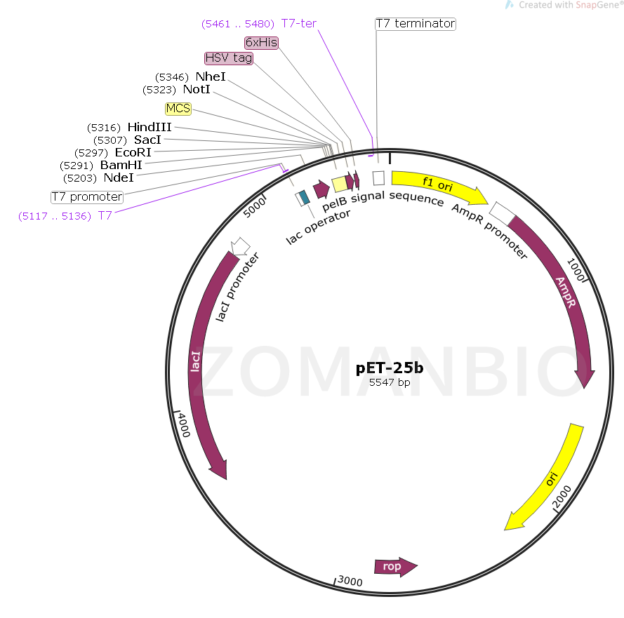 pET-25b質(zhì)粒是一種原核表達(dá)載體,C端含有一個(gè)6×His標(biāo)簽、HSV標(biāo)簽,N端含有一個(gè)pelB前導(dǎo)肽。該質(zhì)粒含有多個(gè)常用的酶切位點(diǎn),便于不同基因克隆。表達(dá)由宿主細(xì)胞提供的T7 RNA聚合酶誘導(dǎo),目的基因被克隆到質(zhì)粒載體上,受噬菌體強(qiáng)轉(zhuǎn)錄及翻譯信號(hào)控制。pET25b載體的單一的多克隆位點(diǎn)見上面的環(huán)狀質(zhì)粒圖譜。注意:載體序列是以pBR322質(zhì)粒的編碼規(guī)矩進(jìn)行編碼的,所以T7蛋白表達(dá)區(qū)在質(zhì)粒圖譜上面是反向的。T7 RNA聚合酶啟動(dòng)的克隆和表達(dá)區(qū)域在質(zhì)粒圖譜中也被標(biāo)注了出來。質(zhì)粒的F1復(fù)制子是被定向的,所以在T7噬菌體聚合酶的作用下,包含有蛋白編碼序列的病毒 粒子能夠產(chǎn)生,并啟動(dòng)蛋白表達(dá),同時(shí)蛋白表達(dá)將被T7終止子序列的作用下終止蛋白翻譯。