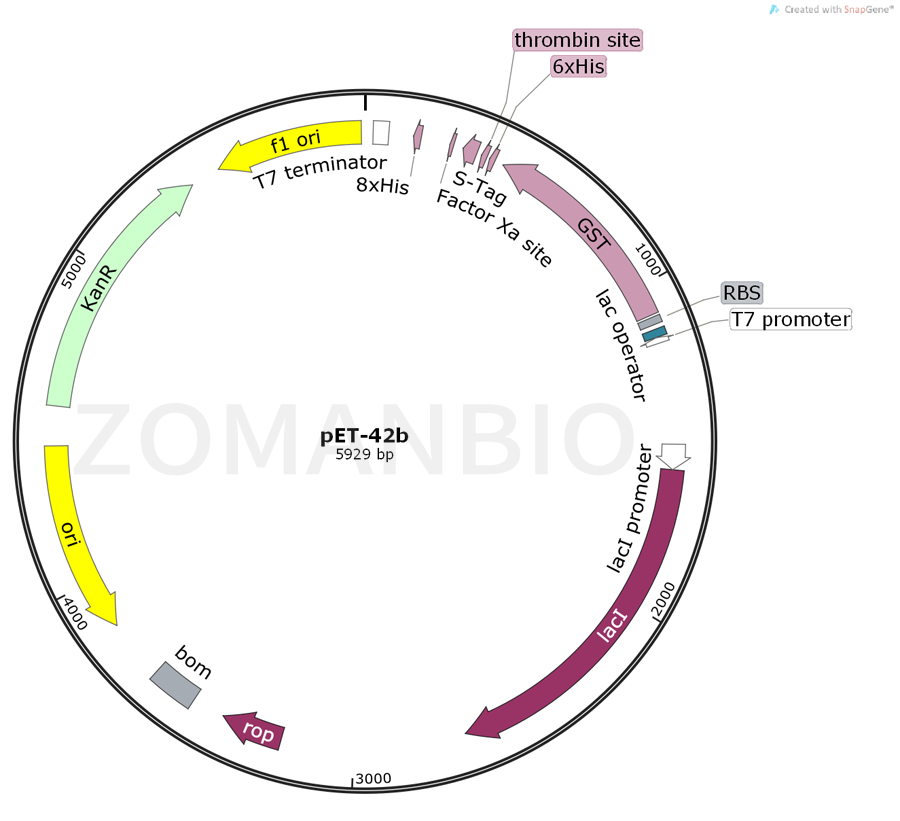 pET42系列載體是用來進行克隆和高水平表達含有220個氨基酸的GST融合純化標(biāo)簽的蛋白表達載體。
