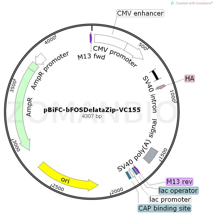 質(zhì)粒序列請(qǐng)下載:ZK524pBiFC-bFOSDelataZip-VC155雙分熒光質(zhì)粒.txt