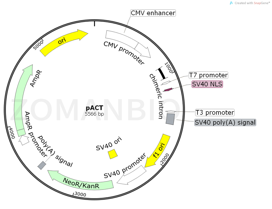 The pACT Vector is a high-copy plasmid in which the human cytomegalovirus (CMV) immediate early promoter drives expression of the herpes virus VP16activation domain (amino acids 411–456). A chimeric intron is located 5′ of the gene segment, and a multiple cloning region is located 3′ of the gene segment for insertion of cDNA clones of interest . The presence of this chimeric intron, in context with the CMV promoter and polyadenylation signal, can result in increased protein expression of cDNA genes linked to these elements. The stop codons and SV40 late polyadenylation region, demonstrated to be efficient for mRNA production , are at the 3′ end of the fusion gene. The fusion gene region is flanked by T7 and T3 RNA polymerase promoters for the synthesis of sense and antisense RNA products. The T7 promoter allows the construct to be translated using the TNT? T7 Quick Coupled Transcription/Translation System (Cat.). Also located on this vector is the neomycin phosphotransferase gene (from Tn5) driven by the SV40 early promoter and followed by a synthetic polyadenylation cassette. This gene confers resistance to the neomycin analog, G418 . The plasmid backbone contains an f1 origin of replication for the production of single-stranded DNA (ssDNA) and the β-lactamase (Ampr) gene for selection of the vector DNA in E. coli.