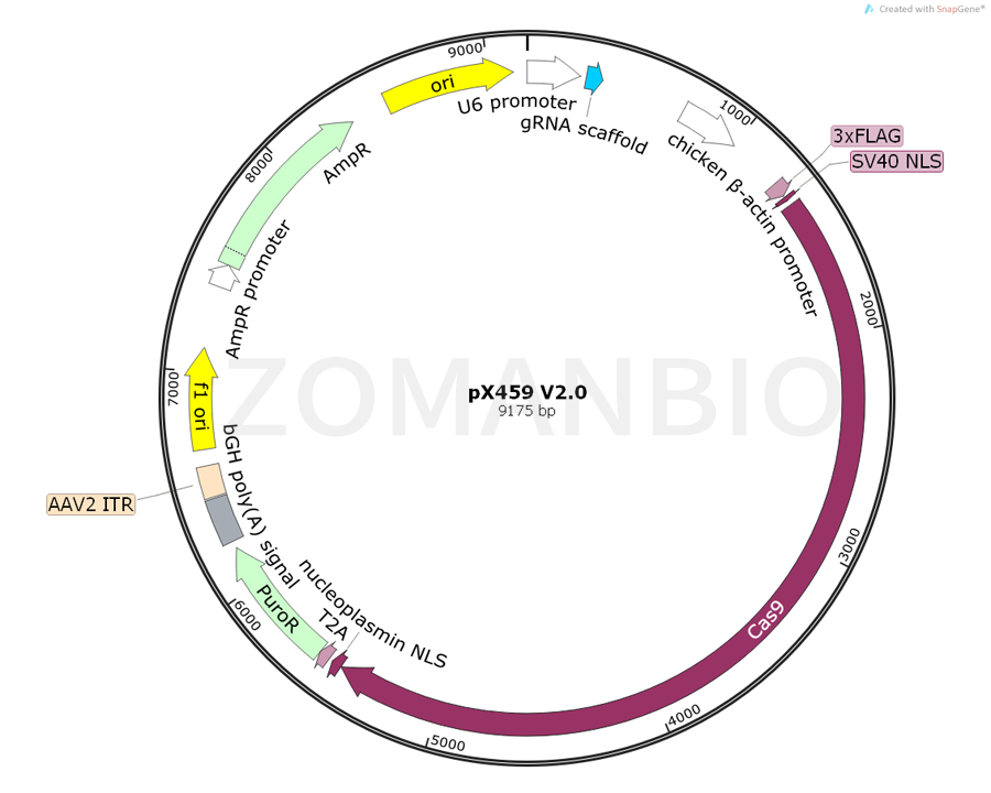 pX459 V2.0是一個(gè)哺乳細(xì)胞Cas9和gRNA基因敲除質(zhì)粒。