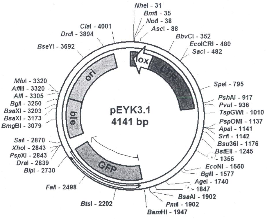 pEYK3.1質粒的參考文獻是Novel retroviral vectors to facilitate expression screens in mammalian cells.