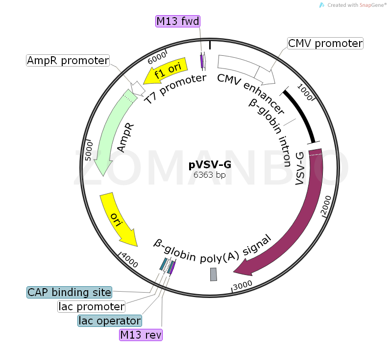 pVSV-G表示G蛋白的水泡性口炎病毒(VSV-G)的控制下CMV立即早期啟動(dòng)子。VSV-G用于假M(fèi)oloney Murine Leukenia病毒(MMLV)-介導(dǎo)病毒進(jìn)入通過逆轉(zhuǎn)錄病毒載體VSV-G與磷脂。靶細(xì)胞膜的組成部分,并促進(jìn)病毒和細(xì)胞膜的融合。利用不需要的細(xì)胞表面受體,可以作為一個(gè)替代病毒包膜蛋白。pVSV-G向量包括靜脈輸液,以提高合成的內(nèi)含子的mRNA的穩(wěn)定性,復(fù)制和氨芐青霉素抵抗細(xì)菌的Col E1起源(Ampr)基因的傳播和細(xì)菌中抗生素的選擇。