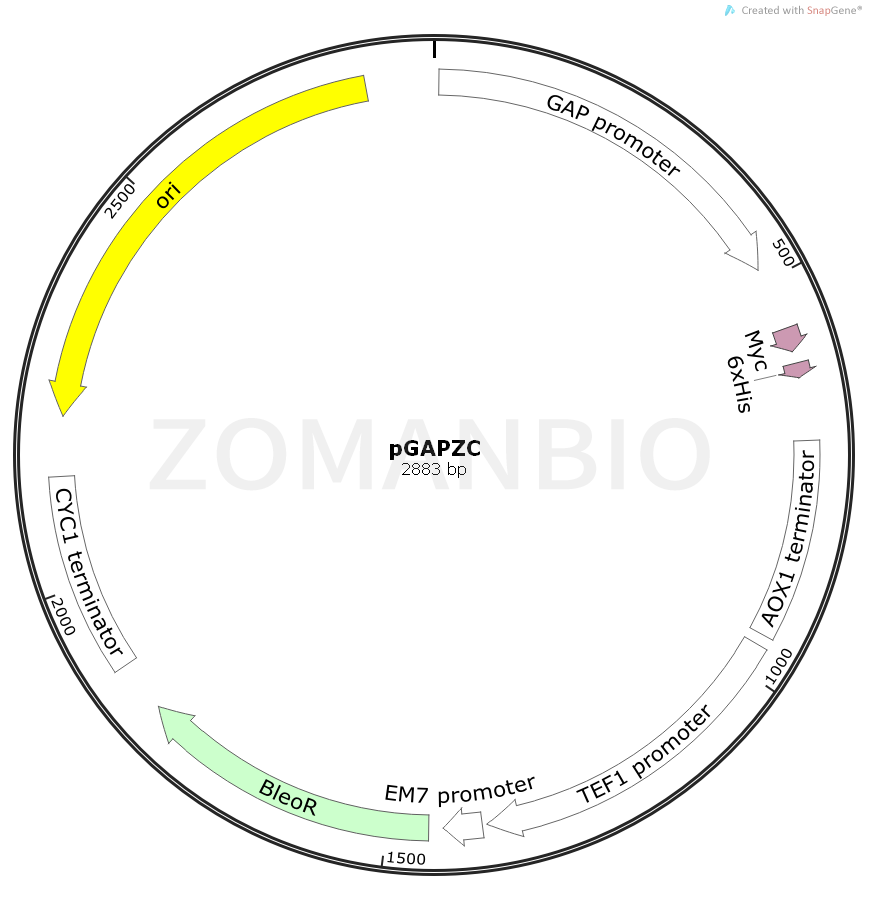 pGAPZ A,B,和C載體(2.9 KB)和pGAPZα,B,和C(3.1 KB)載體使用GAP啟動(dòng)子在畢赤酵母中穩(wěn)定表達(dá)重組蛋白。重組蛋白表達(dá)為為帶有C-末端myc抗原表位和C端His標(biāo)簽的融合蛋白。此外,pGAPZα表達(dá)的融合蛋白在N-端帶有釀酒酵母(Saccharomyces cerevisiae)的α-因子分泌信號(hào)肽。這兩個(gè)系列的載體都提供三個(gè)不同讀碼框的載體,以方便克隆的帶有C-端標(biāo)簽和/或N-末端分泌信號(hào)肽的載體中。這些載體是基于顯性選擇標(biāo)記,Zeocin(博萊霉素)的篩選標(biāo)記可以同時(shí)使用于畢赤酵母和大腸桿菌。