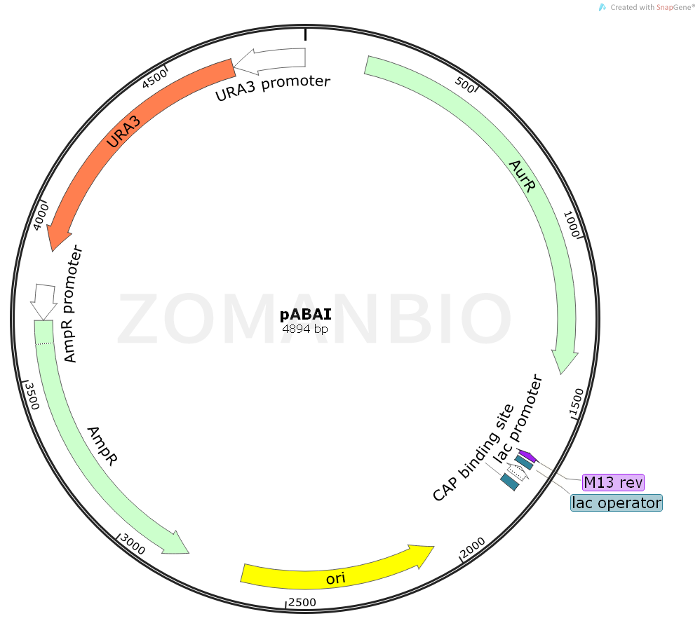 pABAI質(zhì)粒是一種單雜交酵母報告質(zhì)粒,可以識別和分析蛋白質(zhì)與DNA之間的相互作用,而不僅僅是證明蛋白之間的相互作用。這個質(zhì)粒具有AbA抗性因而具有很強的篩選能力,可極大地降低背景水平。