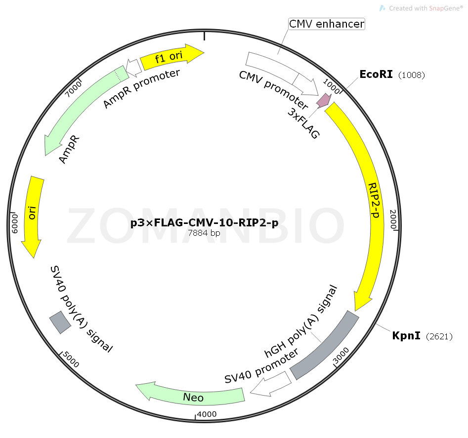 p3×FLAG-CMV-10-RIP2-p質(zhì)粒是一個豬源基因過表達質(zhì)粒,CMV啟動子驅(qū)動3×FLAG標(biāo)簽和RIP2基因融合表達。