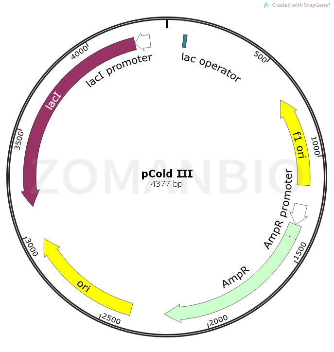 pCold III質(zhì)粒是利用冷休克基因CspA啟動子設(shè)計高效率蛋白質(zhì)表達載體。在啟動子下游處,插入了lac操縱子,以便嚴(yán)格控制表達。此外,5’非翻譯區(qū)(5’UTR),翻譯增強元件(TEE),His標(biāo)簽序列,Xa因子切割位點和多克隆位點(MCS)位于CAPS啟動子的下游。當(dāng)培養(yǎng)溫度切換到低溫時,大腸桿菌暫時停止生長,大部分的大腸桿菌蛋白質(zhì)表達減少,但是一類稱為冷休克蛋白的蛋白質(zhì)被特異性誘導(dǎo)表達。