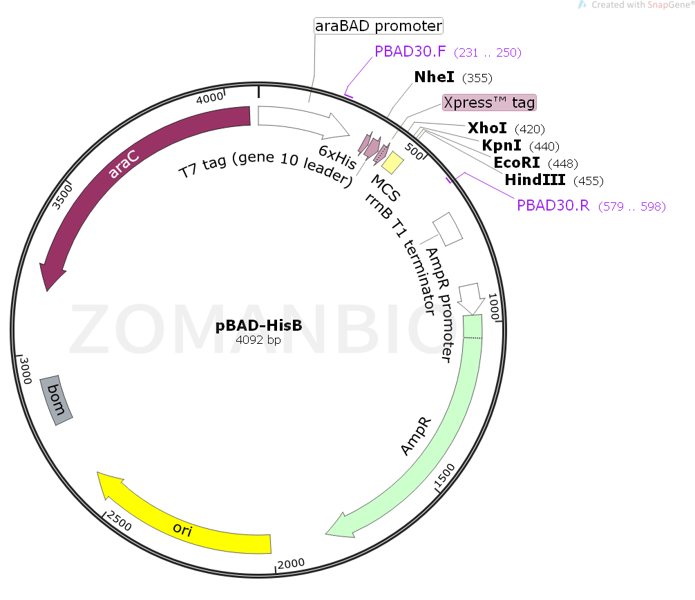 pBAD-HisB質(zhì)粒是衍生于pBR322載體。載體設(shè)計(jì)用來(lái)在大腸桿菌中進(jìn)行可調(diào)節(jié),劑量依賴性的表達(dá)和純化重組目的蛋白。使大腸桿菌araBAD啟動(dòng)子(pBAD)增強(qiáng)了大腸桿菌重組蛋白可溶性表達(dá)的水平。pBAD/His和pBAD/Myc His載體上的調(diào)節(jié)蛋白AraC能夠調(diào)控pBad啟動(dòng)子。pBAD/Myc-His B 載體是阿拉伯糖調(diào)控載體,在無(wú)葡萄糖的培養(yǎng)基中,阿拉伯糖正向調(diào)控目的基因的表達(dá),通過調(diào)節(jié)阿拉伯糖的濃度水平來(lái)優(yōu)化目的蛋白的可溶性表達(dá)。