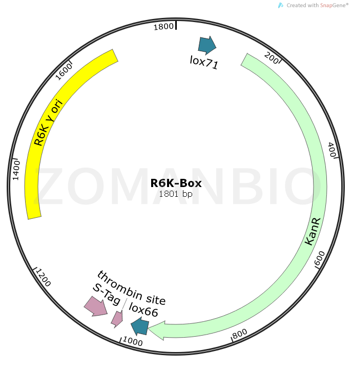 Red重組一定會有一個(gè)通過PCR制備線性的打靶盒子(box)的過程。此質(zhì)粒是Ori R6K控制復(fù)制,只在SM10(λpir)的大腸桿菌中復(fù)制。故用此質(zhì)粒為模板構(gòu)建打靶盒子,不會產(chǎn)生假陽性。此質(zhì)粒包含lox71-KanR-lox66結(jié)構(gòu)。