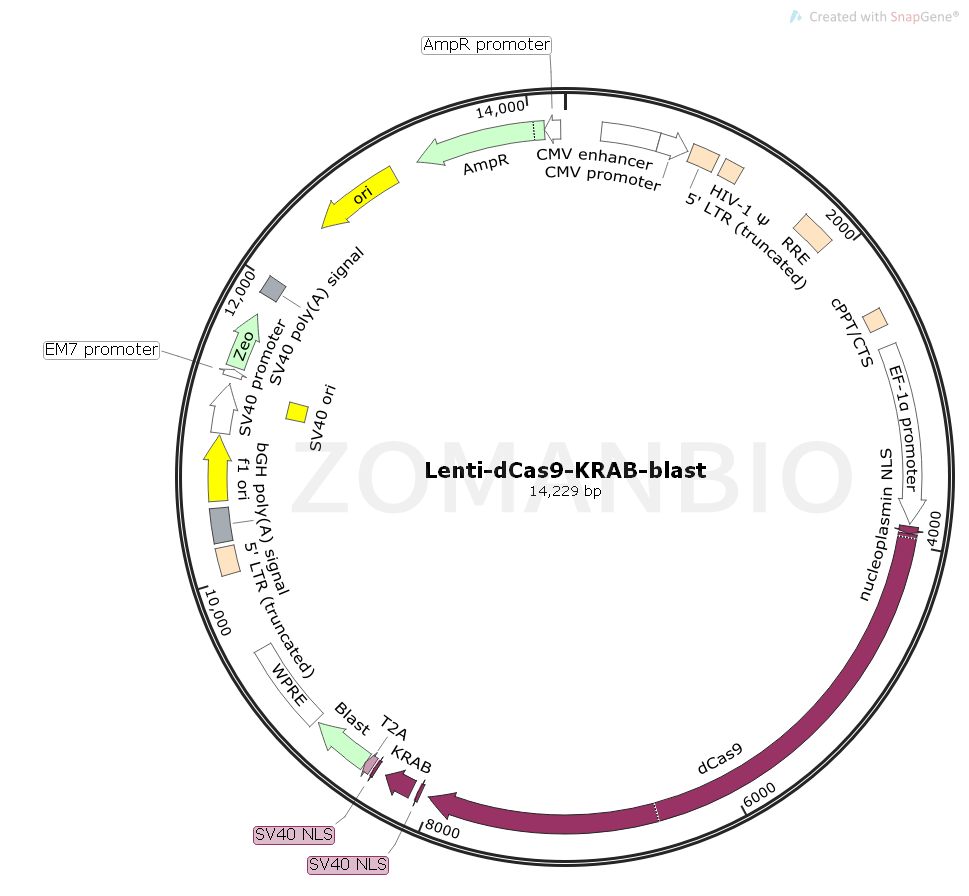 Lenti-dCas9-KRAB-blast質(zhì)粒是一個(gè)慢病毒過(guò)表達(dá)質(zhì)粒,EF-1α 啟動(dòng)子驅(qū)動(dòng)dCas9-KRAB蛋白片段的表達(dá),可用于哺乳細(xì)胞的基因編輯實(shí)驗(yàn)。本質(zhì)粒的參考文獻(xiàn)是:Multiplexed Engineering and Analysis of Combinatorial Enhancer Activity in Single Cells.