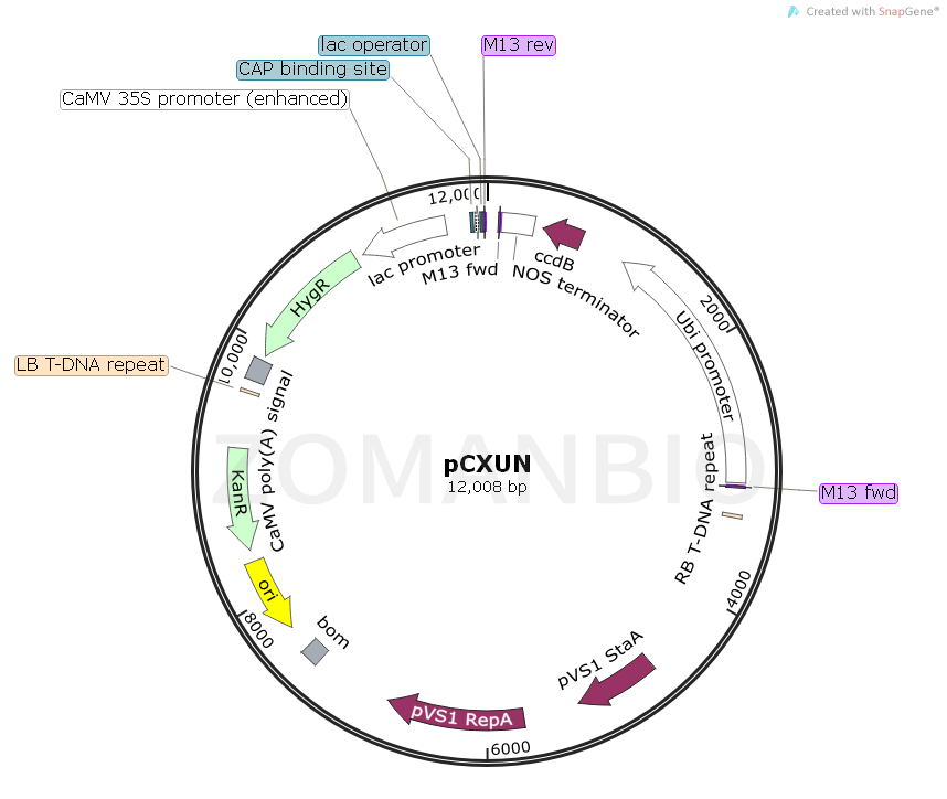 pCXUN質(zhì)粒是一個(gè)植物過(guò)表達(dá)載體,Ubi啟動(dòng)子驅(qū)動(dòng)目的基因的表達(dá)。使用XcmI酶切空載體得到T載體,可連入兩端帶A的PCR產(chǎn)物,并在ccdb致死基因的幫助下,基因克隆的陽(yáng)性率得以大大提高。