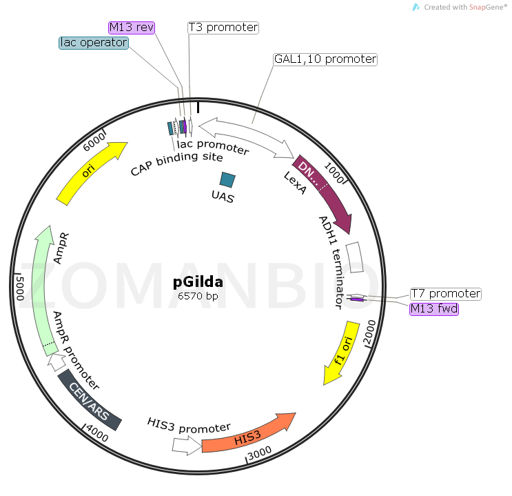 pGilda is a cloning vector used to generate fusions of a bait protein with the 202-residue LexA protein, which acts as a DNA-binding domain in the MATCHMAKER LexA Two-Hybrid System . The hybrid protein is expressed in yeast cells from the tightly regulated GAL1 promoter (PGAL1); transcription is repressed in the presence of glucose and induced in the the absence of glucose and presence of galactose . pGilda carries the HIS3 gene for selection in His– auxotrophic yeast strains and is compatible with MATCHMAKER LexA Libraries. This vector replicates autonomously in both E. coli (using the Col E1 ori) and in S. cerevisiae (using the CEN/ARS ori). Ampr is used for selection in E. coli.